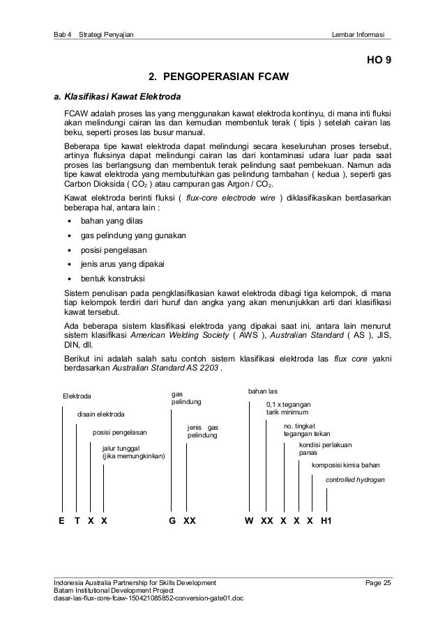 4 Kawat Las FCAW adalah salah satu jenis las listrik yang memasok filler elektroda secara mekanis terus ke dalam busur listrik yang terbentuk di antara ujung filler elektroda dan metal induk Elektroda pada FCAW terbuat dari metal tipis yang digulung cylindrical diisi dengan flux sesuai kegunaannya